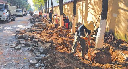 在中心城区迎春街道路改造工程中,工人对树木进行移植。
