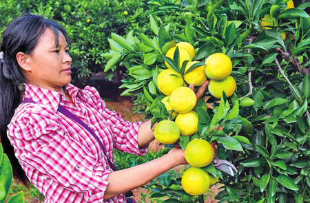 近日,新平县者竜乡马场村300多亩柑桔陆续成熟,果农尹忠秀正在采收黄澄澄的冰糖橙,以每公斤9元左右的价格出售。近年来,新平县通过政策扶持、加大资金投入以及龙头企业的示范带动,柑桔产业得到快速发展,建成了省内目前最大最好的连片冰糖橙种植基地,并成功打造出极具影响力的“褚橙”品牌。据了解,截至今年10月底,全县柑桔种植面积已突破4万亩,仅今年就新增1万亩。全县今年的柑桔总产量预计可达40900吨,可实现销售收入2.34亿元。(记者 潘泉 摄)