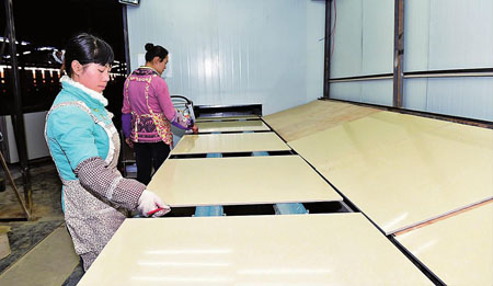 1月4日,易门鑫诺陶瓷有限公司的员工正在生产线上忙碌。该公司是一家专业生产高档墙地砖的陶瓷企业,占地面积300亩,主车间建筑面积达6万平方米,拥有三条高端建筑陶瓷生产线,主要生产高档仿古瓷砖、全抛釉瓷砖、微粉抛光瓷砖3个系列2种规格的墙地砖产品。自去年5月试生产以来,已实现产值2亿多元;今年3条生产线全面投产后,可年产1200万平方米的中高档墙地砖,预计可实现产值5亿元。 (记者 曾永洪 摄)