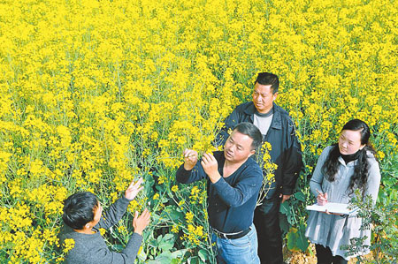 在市农科院研和街道贾井基地百亩油菜高产栽培技术示范田里,该院油料所专家正在查看“玉油一号”油菜新品种的开花结荚情况。“玉油一号”是由市农科院相关人员经过十年努力独立选育完成的第一个高产优质油菜新品种,2014年通过了云南省新品种审定。该品种具有栽培简单、适应性强、丰产性好、含油量高、成熟早等优势,目前已由取得其品种经营权的种业公司在我市及省内其他州市大面积推广。(记者 潘泉 摄)