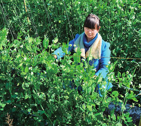 峨山县大龙潭乡迭所村委会把拉宗村民小组一唐姓妇女,正在精心管护她家的7亩菜豌豆。在今年的小春生产中全乡共种植菜豌豆3513亩,占小春蔬菜种植总面积的63%。据估算,全乡菜豌豆产量可达3500吨,预计可实现产值3300万元。(记者 潘泉 普学秉 摄)