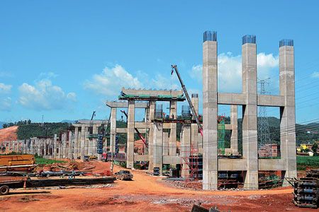 近日,在易门县龙泉街道韩所村,武易高速公路一座大桥的桥柱一排排拔地而起,工人们正在抓紧施工。据了解,这座大桥是武易高速互通主线桥,大桥长1080米、高40米,采用30米预制砼小箱梁施工方式建设,计划投资1亿多元,预计10月竣工。 特约记者 陆伟 摄