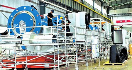 近日,位于华宁县工业园区新庄片区的上海电气风电设备云南有限公司车间里,技术工人正在忙着生产风机。该园区规划面积14.93平方公里,布局为“一园五片区”,入园企业达68户,其中,亿元企业8户,从业人员达5100人。去年,园区实现工业总产值53.1亿元。今年1至5月,实现工业总产值22.8亿元,同比增长13.5%;工业增加值6.8亿元,同比增长20.1%。(记者 曾永洪 摄)