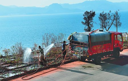 近日,在抚仙湖东岸环湖路华宁县海镜社区段上,园林工人正为绿化带上的植物进行养护浇水。去年10月,华宁县投资640余万元,对辖区环湖路进行绿化提升改造,着力建设一条红花、绿树、青藤相拥环绕、生态野趣的“绿色走廊”。据介绍,该项工程在去年底完工后,园林施工方在总长15.3公里的环湖路两边搭配种下三角梅、紫柳、红叶石楠、常春藤、炮仗花、榕树等10多种乔灌藤植物,总绿化面积超过3万平方米。 (记者 潘泉 摄)