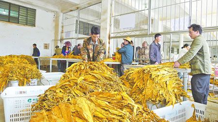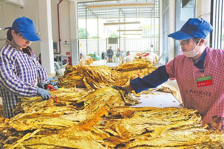 10月3日,在红塔区大营街烟叶收购站,工作人员正认真分拣烟叶。截至10月3日,大营街街道共收购烟叶30万公斤,均价32.52元,上等烟比例达70.1%,烟农收入比上年增加,圆满完成2016年烟叶收购任务。 特约通讯员 张如琴 摄
