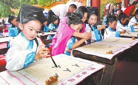 着汉服、敬师礼……9月28日上午,中心城区小庙街文庙内锣鼓擂响、雅乐齐鸣,2016年“和谐社会·齐家为本”纪念孔子诞辰2567周年活动在这里举行。据了解,本次活动由红塔区总工会、玉溪市传统美德促进会联合主办,来自红塔区区直、各乡(街道)工会等部门的两百多人到场参加。典礼现场,司仪行祭奠礼,主祭者恭读并焚烧祭文,祈求国泰民安,李棋中心小学还举行了“开笔礼”“朱砂开智”等活动。图为身着汉服的学童在老师的指导下学写人生的第一个字。 记者 李铎业 摄