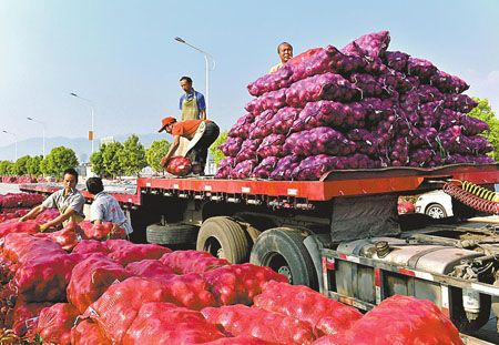 在珠山路,笔者看到路边停放着几辆运洋葱的大型平板货车,一些工人正在装载洋葱。来自山东的收购商蒋先生说,受外部存量不足、库内存量销售殆尽、省外洋葱减产等因素影响,今年洋葱价格与往年相比高出三四倍。华宁红皮、白皮洋葱个大、品质好,深受广大客商的欢迎。