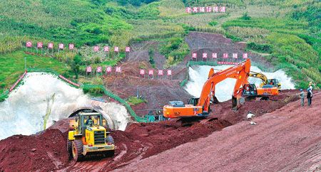 10月14日,位于华宁县宁州街道高寨村的弥玉高速华宁试验段老窝铺一号隧道口,大型机械正抓紧作业。弥勒至玉溪高速公路是弥勒至楚雄高速公路的重要组成部分,全长121.64公里,估算总投资为227.32亿元。华宁试验段全长7.9公里,按双向六车道高速公路标准建设,设计速度100公里/小时,整体式路基宽度为33.5米,分离式路基宽度为16.75米,工程概算投资13.68亿元。 (记者 李智林 曾永洪 摄)