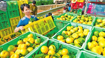 10月14日,华宁县华溪镇甫甸村果农王华林把刚采摘的柑橘卖给收购商。该县紧紧围绕市第五次党代会提出的“四带多园”新布局,积极打造华宁高原特色水果经济园,按照“生态建设产业化,产业发展生态化”的思路和“公司+基地+农户”的发展模式,突出柑橘产业为主,柿子、葡萄等其他水果为辅,大力发展高原特色水果经济。今年,全县柑橘种植规模达9.6万亩,预计实现产量21万吨,产值8.5亿元。 ( 记者 李智林 曾永洪 摄 )