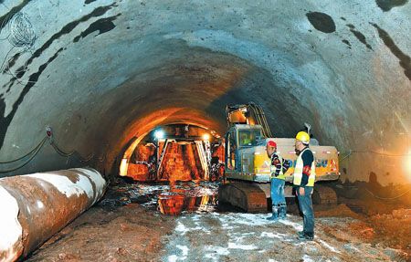 近日,在江通高速公路雄关隧道建设现场,工人正在抓紧施工。该隧道为中跨度、分离式双向四车道越岭隧道。目前,全长2748米的隧道左幅已开挖140多米。江通高速公路是我市“五网”建设重点项目之一,全线采用双向四车道建设标准,设计速度为80公里/小时,起点为江川区大寨村,止于通海县秀水沟,连接通建高速公路,路线长34.3公里,计划投资48亿元,预计2017年8月全面建成通车。(记者 曾永洪 摄)