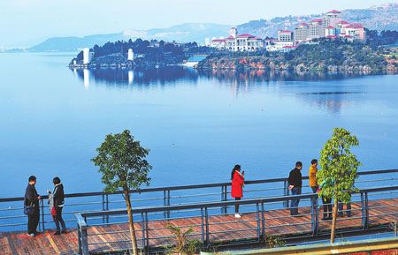 2016年12月29日,几位外地游客在澄江县抚仙湖东岸大湾村段刚刚建好的仙湖时光栈道上观湖赏景。据了解,仙湖时光栈道西起尖山村小学,东至海口镇大石洞,全长约28公里,沿湖岸线建设。该项工程于2015年2月初开工建设,到目前施工已近扫尾。从2017年元旦起,游客即可在这条绿色生态栈道上进行徒步观光游览。 记者 潘泉 摄