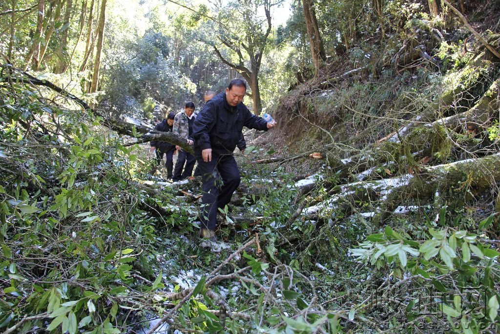 在高鲁山上,五天前下过的大雪还未融化,道路被积雪压断的树枝阻断。陈主任一行踩在厚厚的积雪上,沿路步行10余公里走进高鲁山原始森林腹地,查看林木保存保护情况。调研组了解到,高鲁山最高海拔2614米,总面积7.89万亩,一半面积属峨山县,近三分之一面积在岔河,保护核心区在谢札。2011年以来,甸中、双江、岔河、玉溪洛河等多条防火通道深入高鲁山腹地,进山路口较多,在为森林防火扑救提供便捷通道的同时,也为不法分子盗取林木、毁林烧炭提供了便利,高鲁山自然水源林保护难度较大。近年来,当地政府通过采取严格取缔非法炭窑、增设进山路口卡点等办法,对遏制破坏森林行为取到了一定的积极作用。但离做好全面保护,为子孙后代留下珍贵资源的要求,还远远不够,强化监管,加大保护形势迫在眉睫。