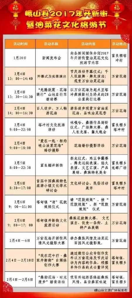 2017年2月4日至6日,峨山县将举行“梁子一路情·扎实唻果嗦”开新街暨油菜花文化旅游节系列活动,包括原生态彝文化祭龙、祭鼓仪式、接送花鼓娘娘、万亩花海千人花鼓舞·舞龙实景演出、舞龙大赛、中国最长彝绣作品封针仪式、首届中国彝族特色旅游小镇文化研讨会、鸡王争霸赛、长龙宴、“龙腾鼓震·花海骑行”全省山地自行车邀请赛、万亩花海开新街风情风光摄影大赛、“爱在一起·相约峨山油菜花海”婚纱摄影活动、千人篝火晚会、民间文艺巡演、商贸及特色美食等内容。