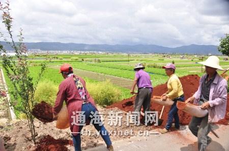 在杞麓湖南岸长河段,运松红土的车辆往来,工人们分工合作,开挖树坑、植入树苗、填土、浇水,施工现场如火如荼,一株株垂丝海棠、桂花扮靓了湖岸,配合着垂柳和喜树等树木,湖岸一派生机盎然的景象。