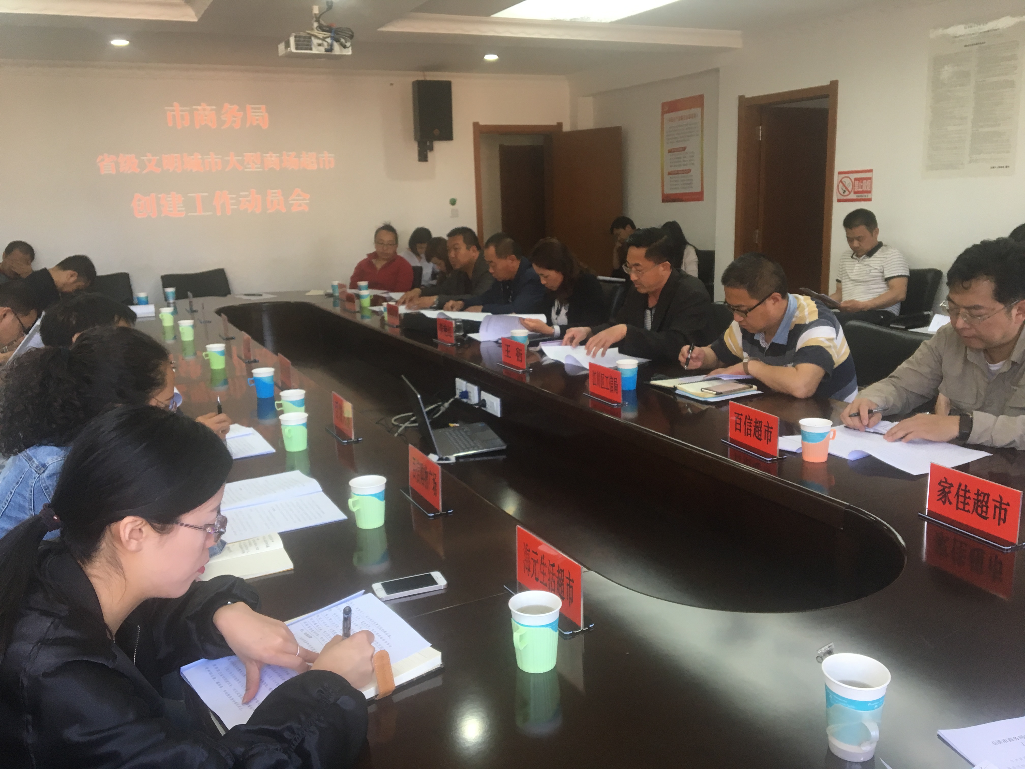 为认真贯彻落实市委、市政府创建省级文明城市的安排部署,确保各项创建工作任务落实到位、圆满完成。4月13日上午,市商务局召开省级文明城市大型商场超市创建工作动员会。市、区(红塔区、江川区)商务主管部门分管领导及相关科室人员,两区12家大型商场超市负责人和工作人员近40人参加了会议。