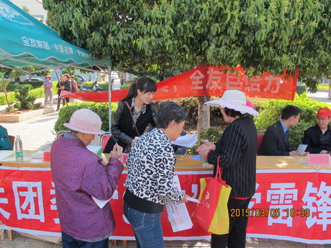 为继承和发扬中华民族的传统美德,传播志愿服务理念,大力弘扬雷锋精神和“奉献、友爱、互助、进步”的志愿精神,2015年3月5日上午9:00,共青团通海县委组织检察院、法院、司法局、卫生局、防震减灾局、科协、供电公司、驻通武警部队等单位、企业以及广大团员青年、青年志愿者,在县城城西公园内开展防震减灾科普知识、法律知识、安全用电等宣传和医疗服务、健康咨询、义务理发、家具维修等学雷锋做好事志愿服务活动,在全县掀起了“向雷锋同志学习”的热潮。