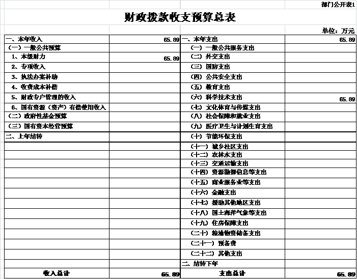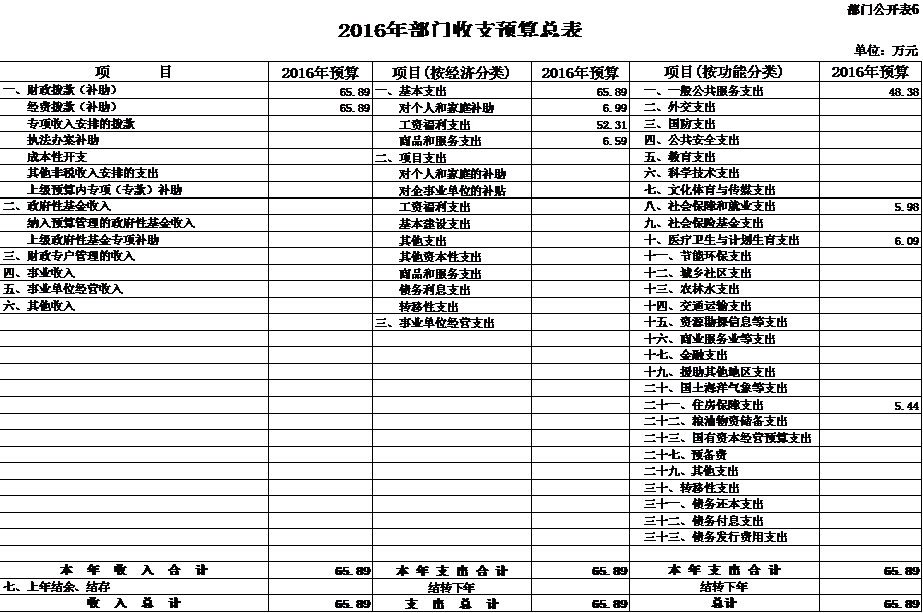 2016年部门预算总收入65.89万元;2016年部门预算总支出65.89万元,按经济分类为:基本支出65.89万元(包括对个人和家庭补助6.99万元、工资福利支出52.31万元、商品和服务支出6.59万元);按功能分类为:一般公共服务48.38万元、社会保障和就业支出5.98万元、医疗卫生支出6.09万元、住房保障支出5.44万元。