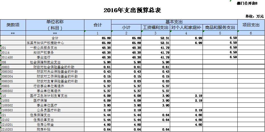 根据《玉溪市预算信息公开工作的实施意见》(玉政发〔2011〕60号)规定和预算管理相关要求,现将玉溪市知识产权援助中心2016年部门预算公开如下,部门预算公开到项级科目。