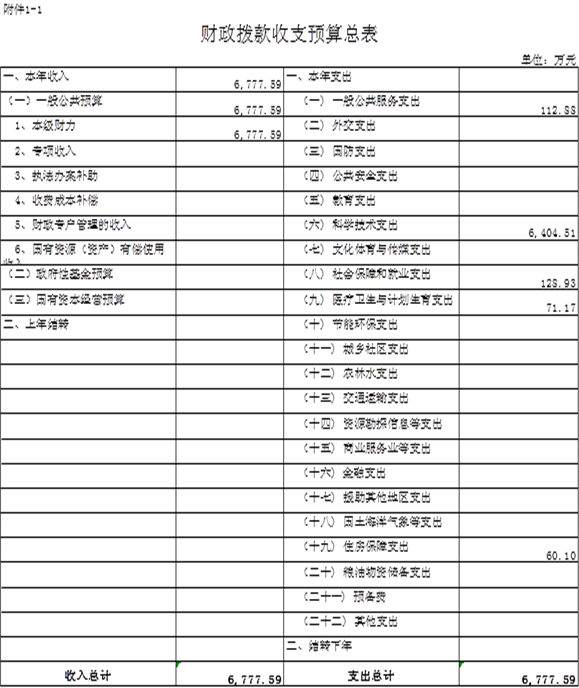 根据玉财预(2017)3号文件核定玉溪市科技局2017年度部门预算总收入6,777.59万元,其中:一般公共预算6,777.59万元。全部为财政拨款收入。