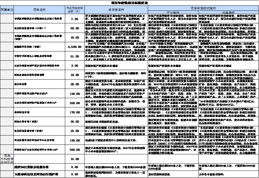 2017年科技局项目支出5,662.80万元,其中:一般行政管理事务17.00万元,占比0.30%,专利试点和产业化推进11.00万元,占比0.19%;一般行政管理事务61.00万元占比1.1%; 产业技术研究与开发415.00万元, 占比7.3%,主要是工业、农业、社会发展科技专项补助;科技成果转化与扩散2,930.00万元,占比51.74%,为新能源汽车补助;其他科技条件与服务支出210.00万元,占比3.7%,主要是工程技术研究中心认定补助;科普活动 6.00万元,占比0.11%,为三下乡和科技活动周资金;其他科技交流与合作支出85.00万元,占比 1.50%,为科技合作与交流专项补助;科技奖励466.80 万元,占比8.24%,其他科学技术支出1,461.00万元,占比25.80%,为执行玉政【2014】39号文件后补助。