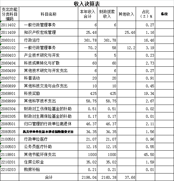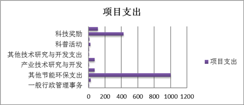 ⑵项目支出收入,其中:一般行政管理事务6万元、知识产权宏观管理25.46万元(其他收入省科技厅专利补助)、一般行政管理事务70.2万元(一般行政管理事务60万元、其他收入12.2万元)、产业技术研究与开发5万元、科技成果转化与扩散60万元、其他技术研究与开发支出6万元、科普活动20万元、其他科技交流与合作支出10万元、科技奖励 425万元、其他科学技术支出58.75万元、其他节能环保支出1000万元。