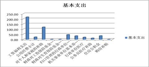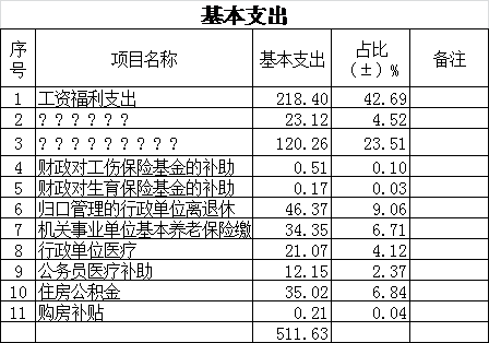 1、基本支出511.63万元,其中:行政运行361.78万元、财政对工伤保险基金的补助0.51万元、财政对生育保险基金的补助0.17万元、归口管理的行政单位离退休 46.37万元、机关事业单位基本养老保险缴费支出 34.35万元、行政单位医疗21.07万元、公务员医疗补助12.15万元、住房公积金35.02万元、购房补贴0.21万元。