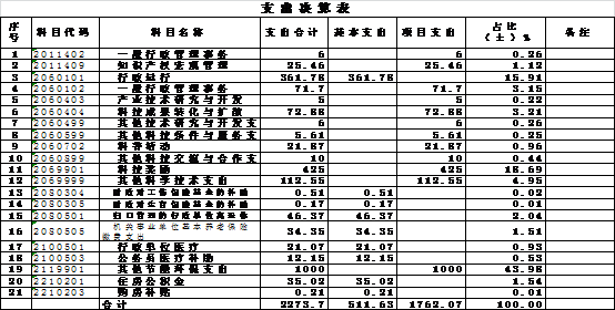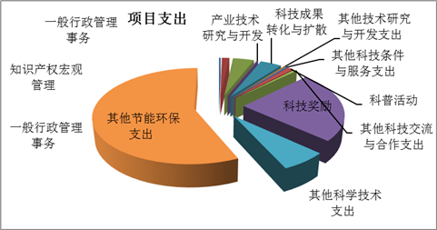 2、项目支出1,762.07万元,其中:一般行政管理事务6万元、知识产权宏观管理25.46万元、一般行政管理事务71.7万元、产业技术研究与开发5万元、科技成果转化与扩散72.88万元、其他技术研究与开发支出6万元、其他科技条件与服务支出5.61万元、科普活动21.87万元、其他科技交流与合作支出10万元、科技奖励425万元、其他科学技术支出112.55万元、其他节能环保支出1000万元