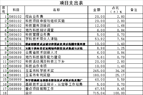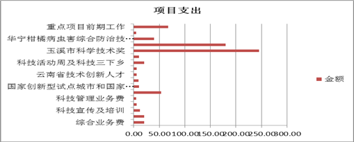 2.科学技术(类)支出1,076.82万元,占一般公共预算财政拨款总支出的48.23%。主要用于维持行政机关日常运行费用工资福利支出361.78万元,项目支出715.04万元,其中:玉溪市科学技术奖245.00万元、玉溪市专利奖励180.00万元、重点项目前期工作67.55万元、学科技术带头人津贴53.92万元、华宁柑橘病虫害综合防治技术试验示范及推广40.00万元、综合业务费20.00万元、科技项目申报与组织实施20.00万元、科技活动周及科技三下乡20.00万元、科技宣传及培训12.00万元、国家创新型试点城市和国家农业示范园申报经费10.00万元、科技合作专项10.00万元、玉溪干热河谷区实蝇绿色防控技术集成与示范8.96万元、地方科技统计调查6.00万元、云南省技术创新人才6.00万元、地方科技服务能力建设5.61万元、科技管理业务费5.00万元、高新技术企业统计、认定等工作经费5.00万元。