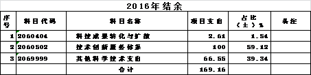 本年结余169.17万元,其中:科技成果转化与扩散2.61万元、技术创新服务体系100万元、其他科学技术支出66.55万元、