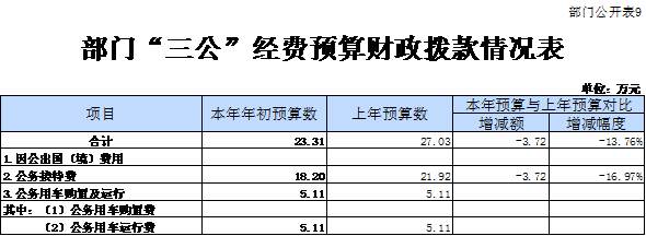 “三公”经费预算数是指各部门从年初预算安排用于因公出国(境)费用、公务用车购置及运行维护费、公务接待费用的预算数。其中,因公出国(境)费,指单位工作人员公务出国(境)的住宿费、差旅费、伙食补助费、杂费、培训费等支出;公务用车购置及运行维护费,指单位公务用车购置费及租用费、燃料费、维修费、过路过桥费、保险费等支出;公务接待费,指单位按规定开支的各类公务接待支出。