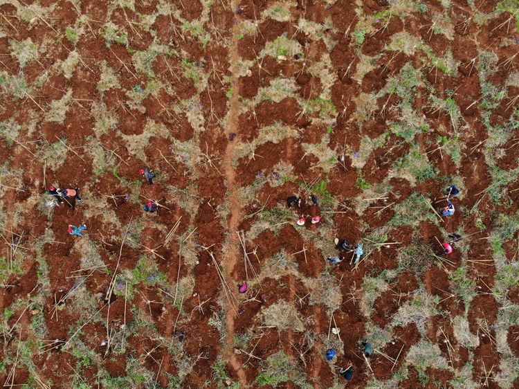 把一棵棵4米多高的树苗栽入,
