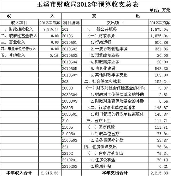 2012年部门预算总收入安排2215.33万元,与2011年相比,增加457.76万元;2012年部门预算总支出安排2215.33万元,与2011年相比,增加457.76万元,主要是增加安排全市“金财工程”信息化大平台建设方面的项目支出。2012年部门预算总支出按经济分类为:基本支出1191.17万元(包括工资福利支出759.10万元、商品和服务支出155.36万元、对个人和家庭补助276.71万元),项目支出1024.16万元;按功能分类为:一般公共服务支出1875.04万元、社会保障和就业支出152.24万元、医疗卫生支出111.71万元、住房保障支出76.34万元。