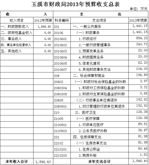 2013年部门预算总收入安排1846.40万元,与2012年相比,减少368.93万元;2013年部门预算总支出安排1846.40万元,与2012年相比,减少368.93万元,主要是安排在全市“金财工程”信息化大平台建设方面的项目支出大幅度减少。2013年部门预算总支出按经济分类为:基本支出1299.48万元(包括工资福利支出832.24万元、商品和服务支出157.19万元、对个人和家庭补助310.05万元),项目支出546.92万元;按功能分类为:一般公共服务支出1441.15万元、社会保障和就业支出196.89万元、医疗卫生支出126.38万元、住房保障支出81.98万元。