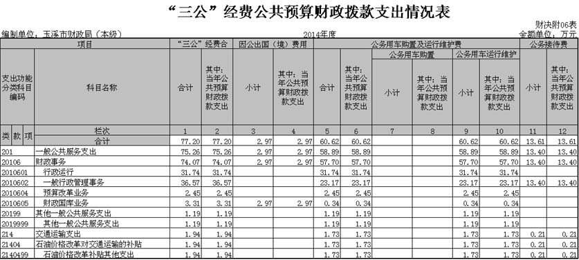 2.“三公”经费:按照党中央、国务院有关文件及部门预算管理有关规定,纳入省级财政预决算管理的“三公”经费,是指省级部门用财政拨款安排的因公出国(境)费、公务用车购置及运行费和公务接待费。其中,因公出国(境)费反映单位公务出国(境)的住宿费、旅费、伙食补助费、杂费、培训费等支出;公务用车购置及运行费反映单位公务用车购置费及租用费、燃料费、维修费、过路过桥费、保险费、安全奖励费用等支出;公务接待费反映单位按规定开支的各类公务接待(含外宾接待)支出。